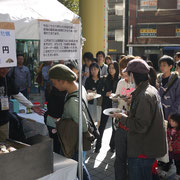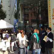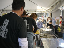 両日共、外にずっと居ても心地いい秋晴れ。会場となった新宿の全労済ホール スペース・ゼロは、大勢のお客さんで賑わった。イベント初日、荒波牡蠣の身の状態を説明する看板もかかげられていたが、開始早々から、焼き荒波牡蠣は大人気。石森さん達の心配をよそに、すぐにお客さんの列が出来た。濃厚な味に皆さん舌鼓。ビール片手に何個も食べている方達も。荒波牡蠣を食べに来た人達、荒波牡蠣を応援に来てくれた人達で、テントの周りは終日賑わっていた。とりわけ鹿立、福貴浦の浜に震災後、支援に入っていたボランティア達が現れると賑やかな同窓会のようだった。