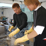 初日の朝、オープン前の会場で、鹿立、福貴浦からの刺客(笑)に再会。シゲさんレポにもあるように、同じイベントに参加できることが我々も本当に嬉しかった。夏の石巻公演でもお世話になった浜の大将、石森さんと海共メンバー、マコトくんと石森さんの息子、ハヤトくん。彼らは、水揚げしたばかりの荒波牡蠣を3000個以上トラックに積んで新宿に乗り込んできた。