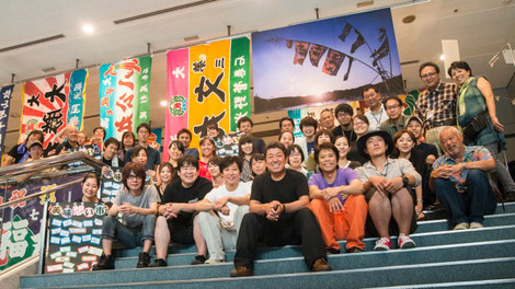 大漁旗は、牡鹿半島狐崎にある東浜小学校からお借りできた。東浜小学校は、2012年6月の石巻公演の時に会場としてお借りした小学校だ。浜の小学校は、運動会などの学校行事で大漁旗が飾られる。東浜小学校には鹿立浜と福貴浦の漁師さんたちから寄贈されていた大切な大漁旗があった。そして、その大漁旗を全部貸していただけた。劇場の雰囲気は完全に浜になった。